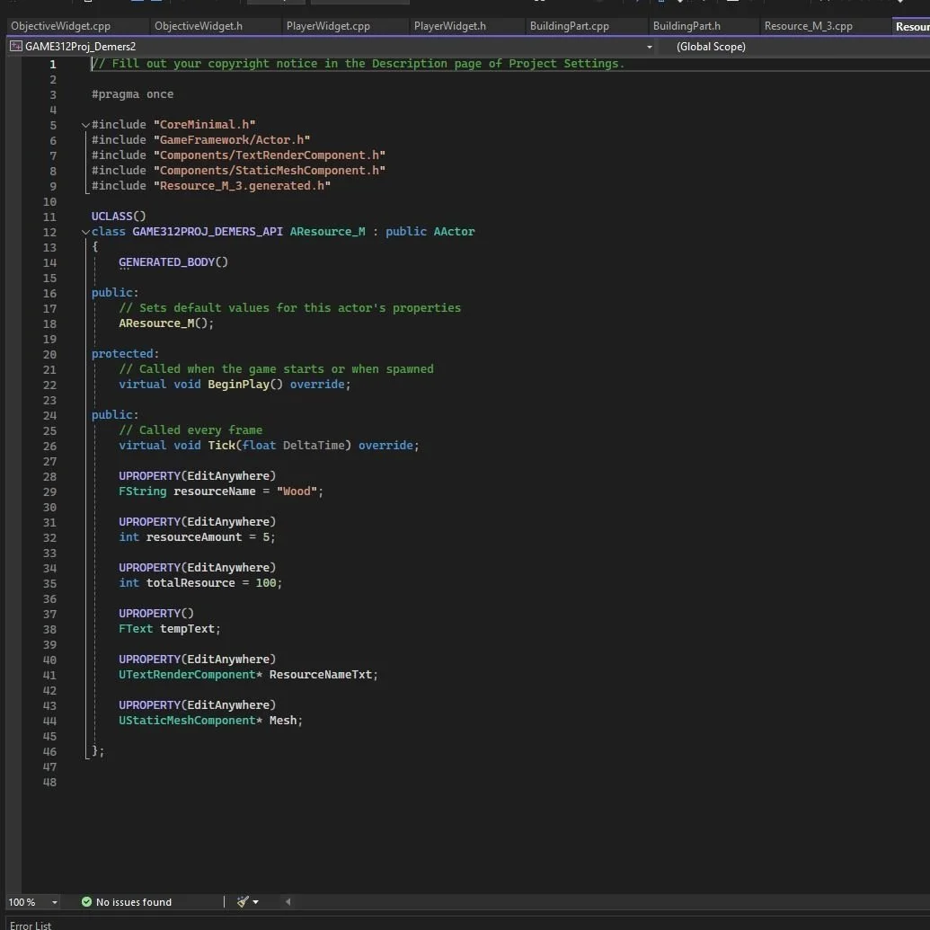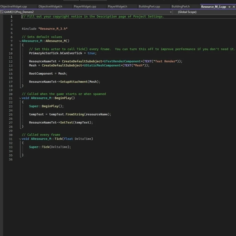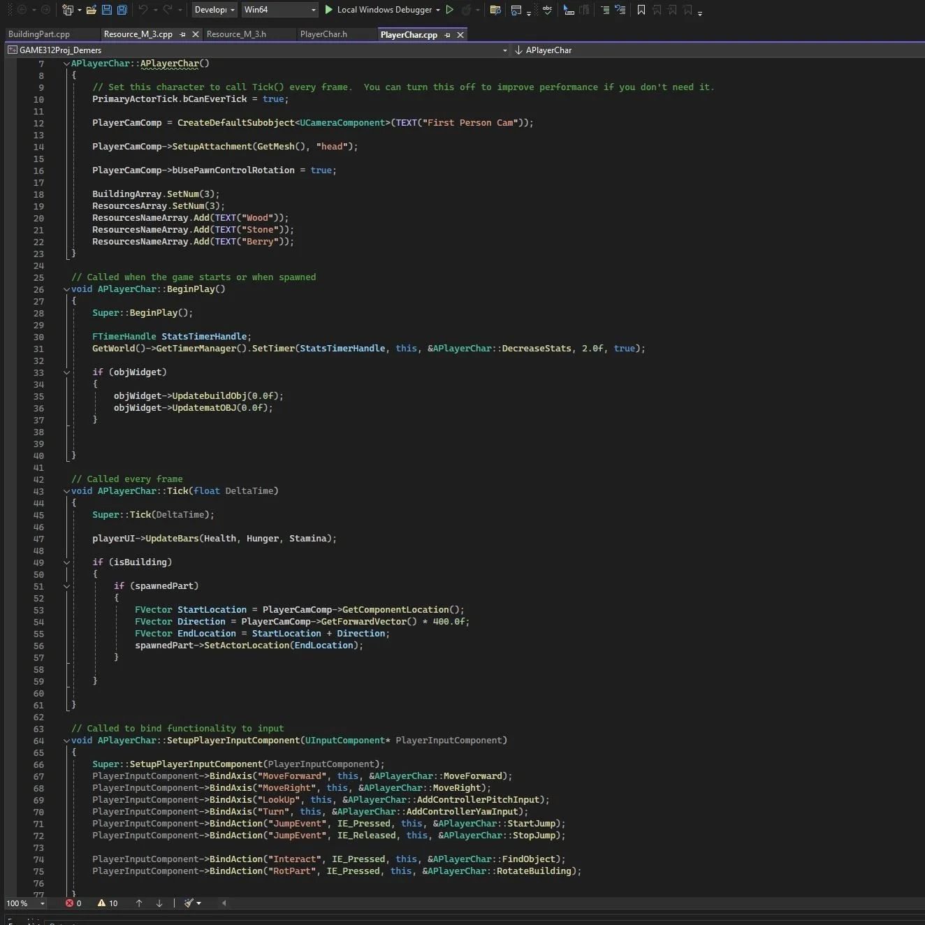 I will try to show as much C++ as possible, but there is a lot to this code. I will mainly show the major chunks of code such as the Player Character code and Resource Collection code.